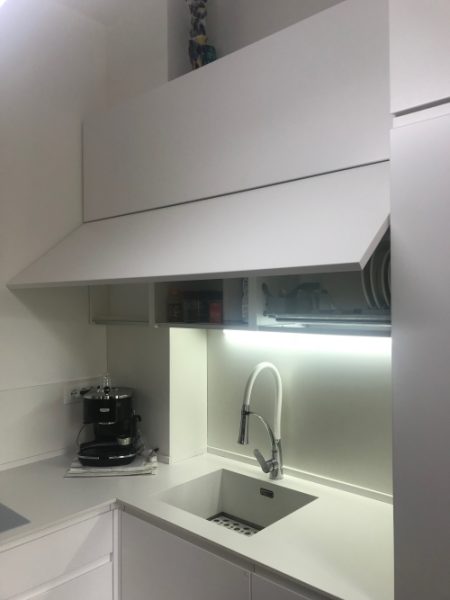 Il total white è sempre di gran effetto. Impreziosisce la nostra cucina laccata il piano in HPL spessore 12mm.
